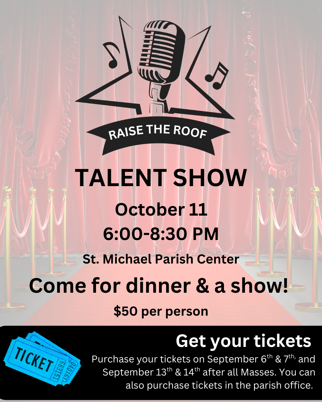 Tickets are $50 and can be purchased after Mass, through the parish office, or online. Ticket sales end on Friday, October 3rd.